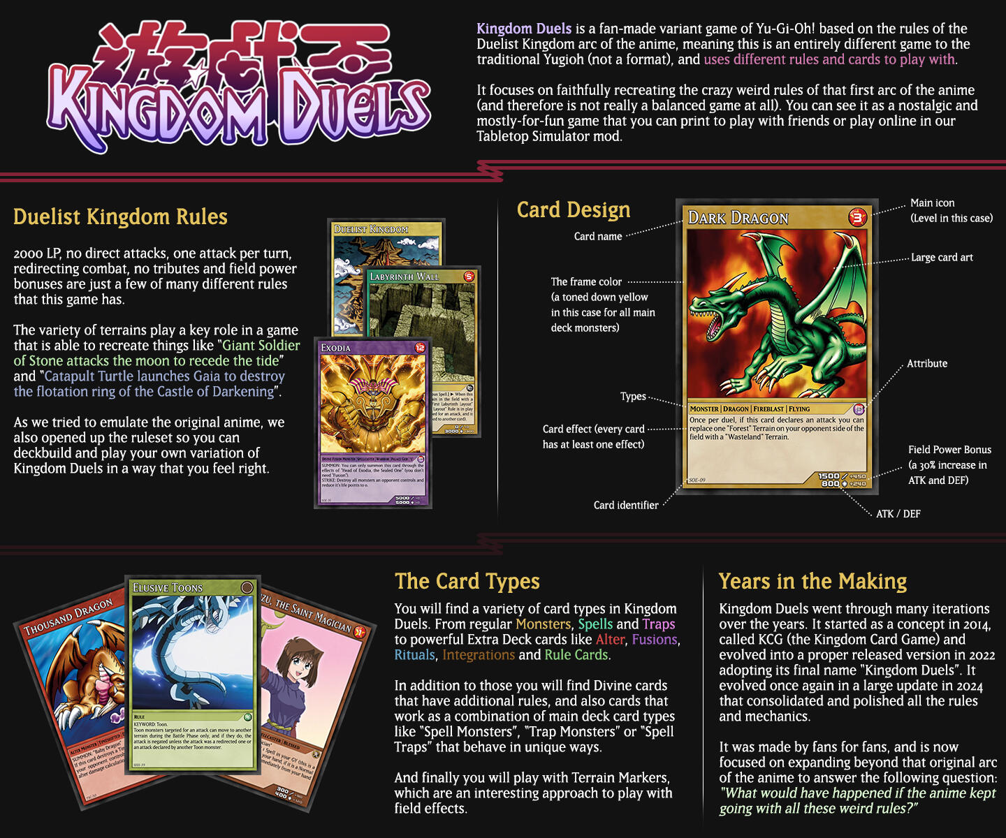 Kingdom Duels is a fan-made variant of the Yu-Gi-Oh! card game played with its own set of cards and rules, directly inspired on the gameplay of the Duelist Kingdom arc of the Duel Monsters Anime.It’s a recreation of the thematic spirit of the Duelist Kingdom Arc from the Anime, adapting those "weird rules" to an actual game with fun interactions and crazy mechanics.This game was made on an interpretation of the japanese Anime, not the Manga or the english dub. It’s mostly a nostalgic project aimed to recreate those weird moments like the iconic “Attack the Moon!”.If you want to know more about it check our Discord!